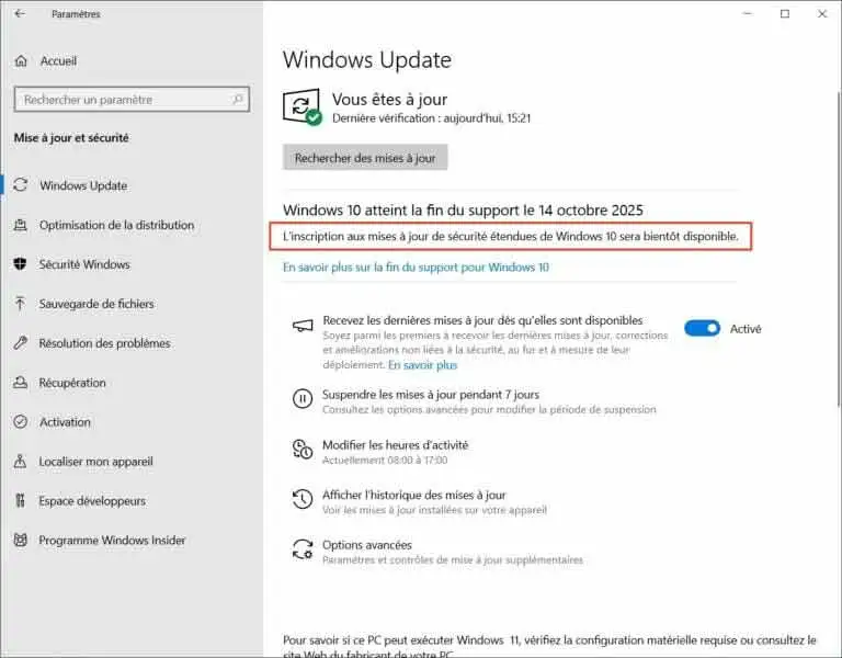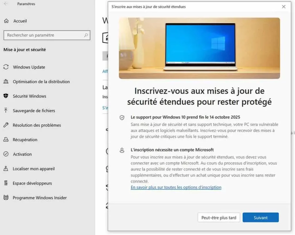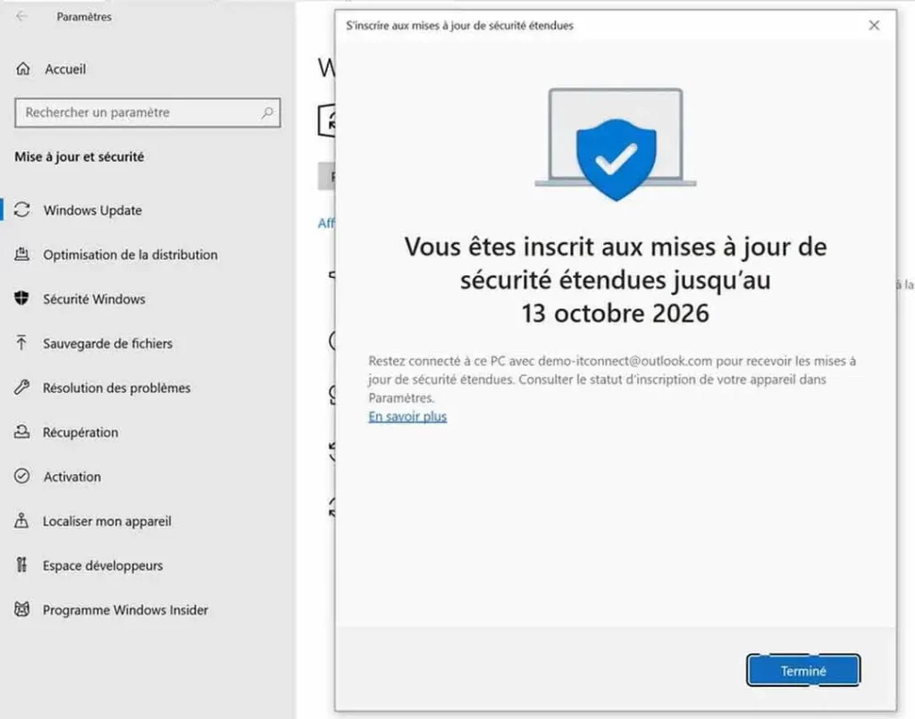 En résumé, il suffit d’utiliser un PC en mode administrateur avec un compte Microsoft, et pas un compte local, et s’inscrire au programme ESU quand il sera proposé dans Windows Update, dans les paramètres de Windows 10 (Menu démarrer → Paramètres → Windows Update). C’est tout !